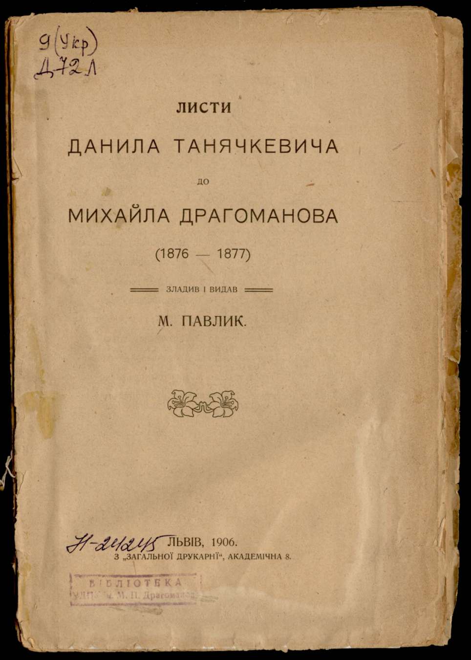 Листи Данила Танячкевича до Михайла Драгоманова (1876-1877) / Зладив і видав М. Павлик. – Львів, 1906. – 35 с.