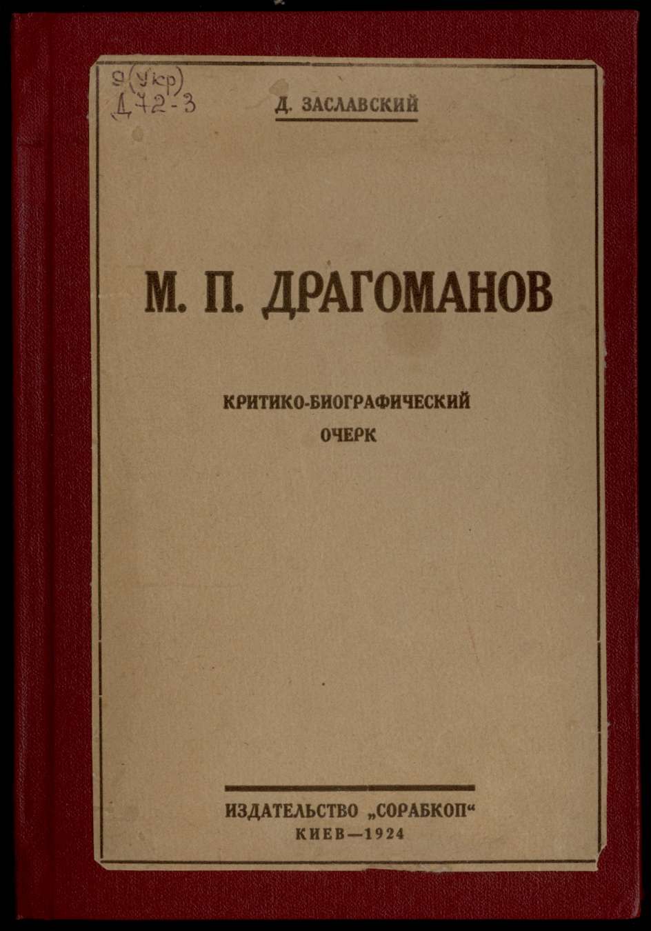 Михаил Петрович Драгоманов : критико-биографический очерк / Д. Заславский. – Киев : Сорабкоп, 1924. – 170с. ; 23см