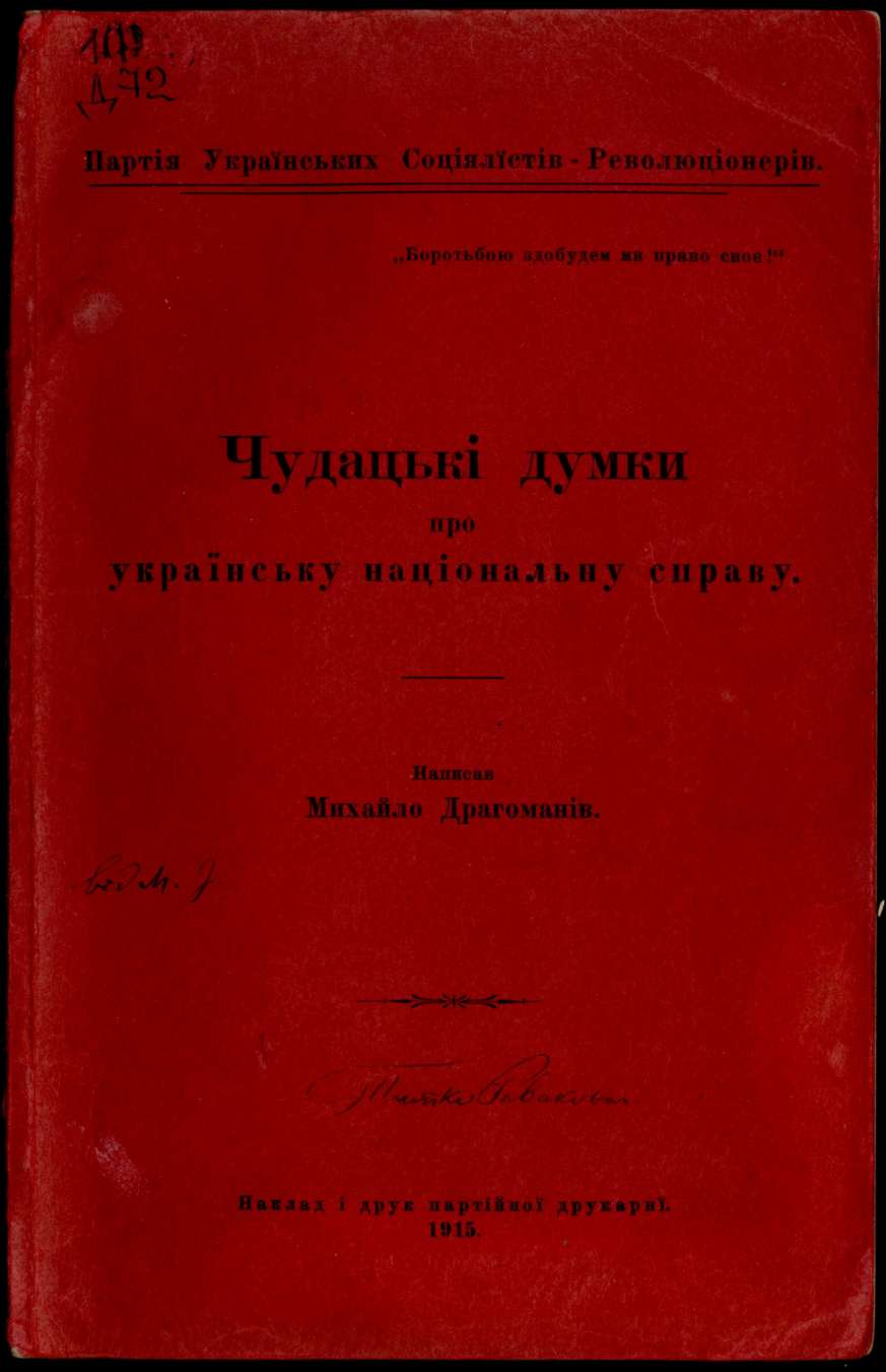 Чудацькі думки про українську національну справу / М.П. Драгоманов. – Партія Укр.. Соц.-революціонерів. – 1915. – 124 с.