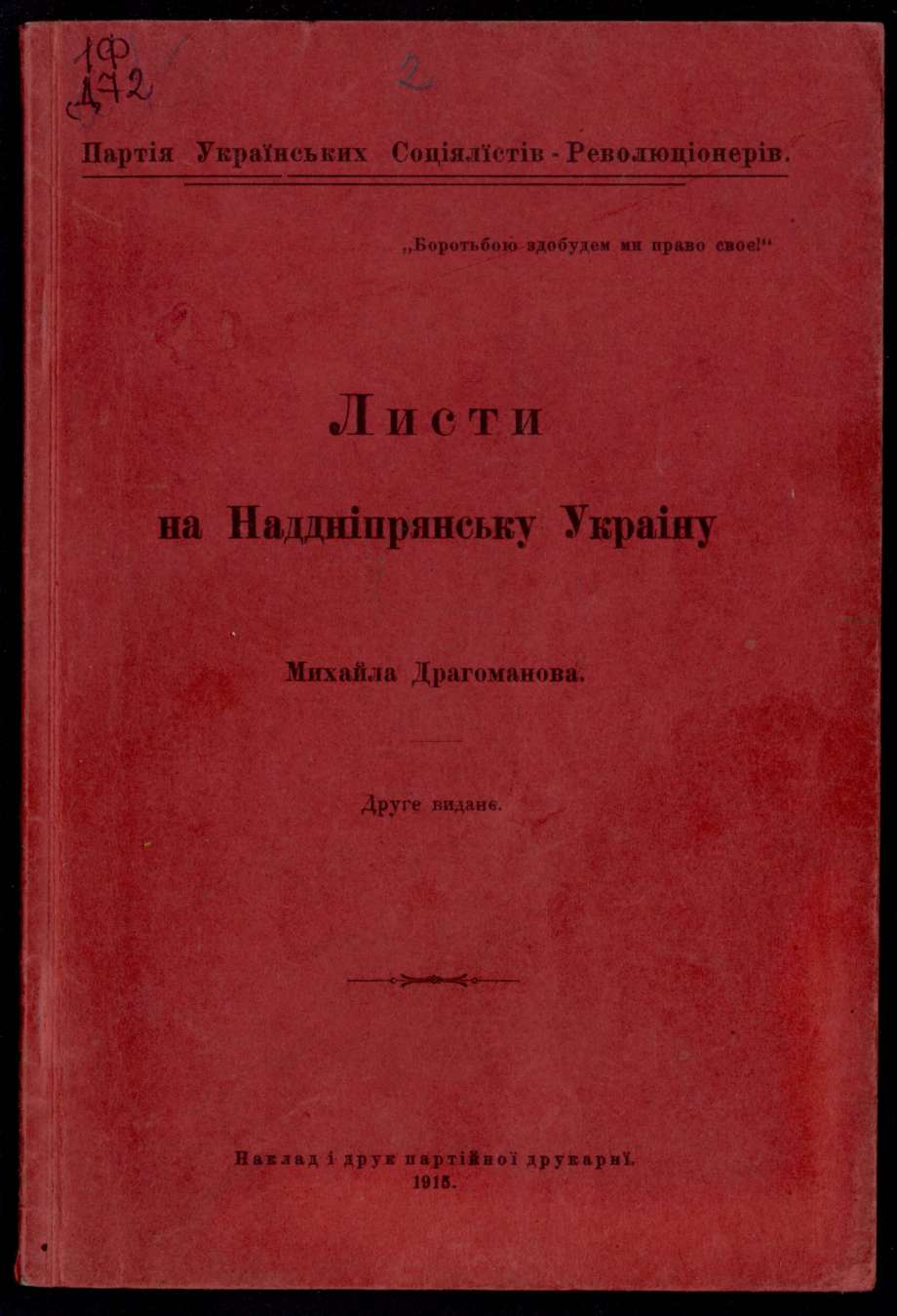 Листи на Наддніпрянську Україну / М.П. Драгоманов. – Партія Укр. Соціялістів-Революціонерів. – 2-ге вид. – Наклад і друк парт. Друкарні, 1915. – 114 с.