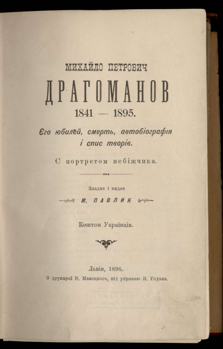Михайло Петрович Драгоманов, 1841-1895: Его юбилей, смерть, автобіографія і спис творів / Зладив і видав М. Павлик коштом українців. – Львів: Друк. В. Манецького, 1896. – 442 с.