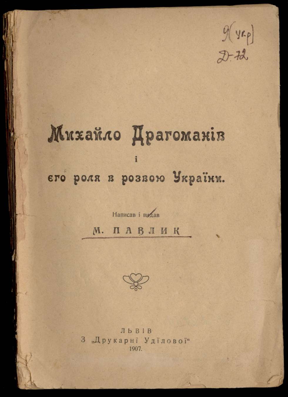 Михайло Драгоманів і єго роля в розвою України / М. Павлик. – Львів, З «Друкарні Удїлової», 1907. – 91 с.