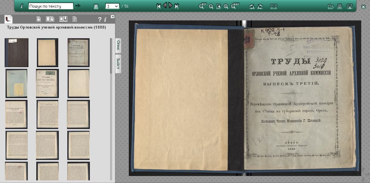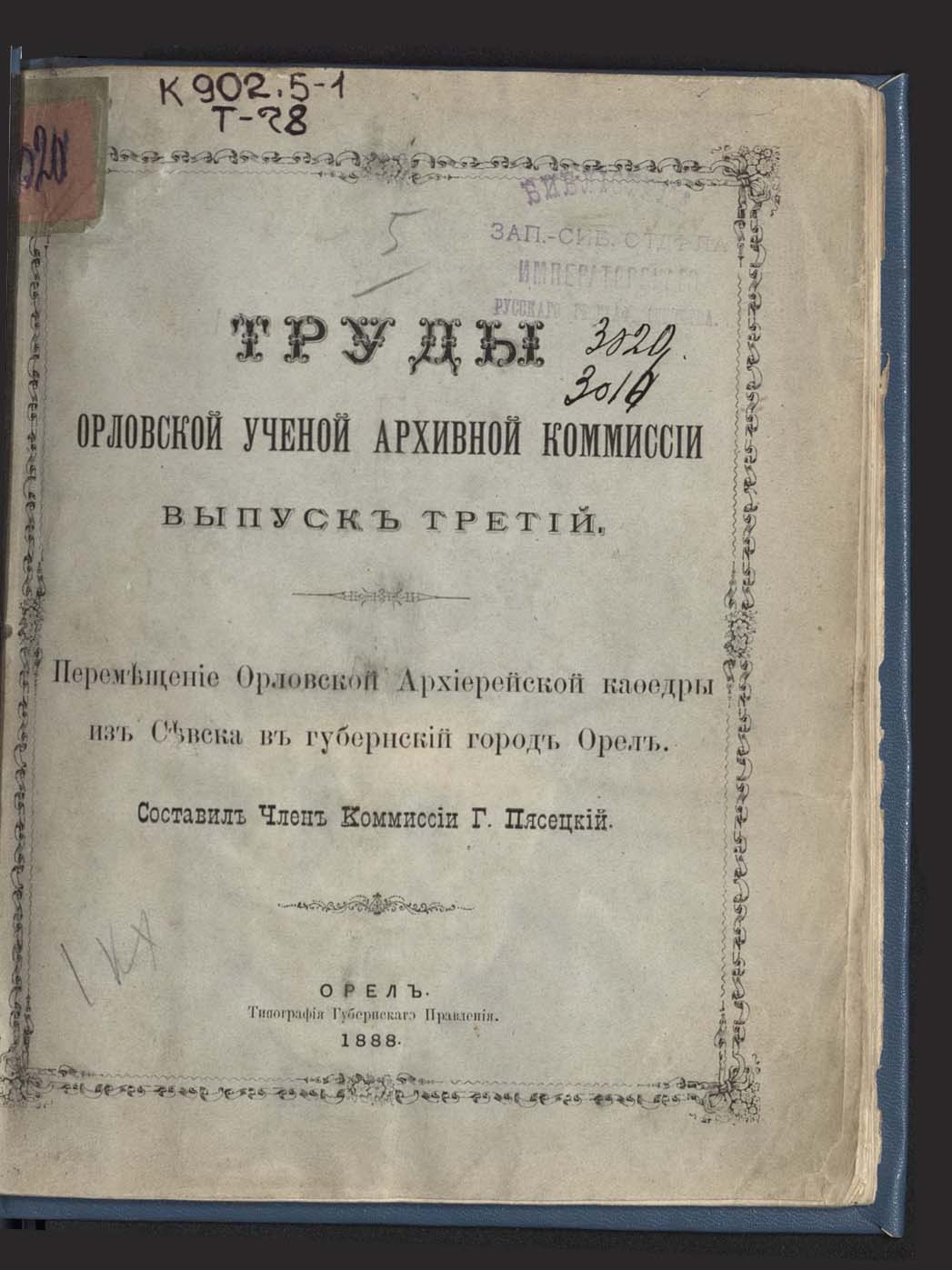 Труды Орловской ученой архивной комиссии / сост. Г. Пясецкий. – Орел : Тип. губернского правления, 1888. – Вып. 3. : Перемещение Орловской архиерейской кафедры из Севска в губернский город Орел. – 47 с.